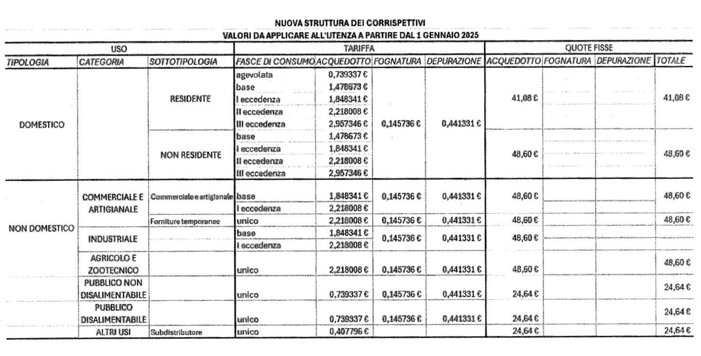 Il sistema tariffario, con le sue articolazioni, è pensato in modo tale da garantire da una parte l’equilibrio finanziario della gestione del servizio idrico integrato e d’altra la “sostenibilità” economica, anche per le fasce meno abbienti. La tariffa è costituita da una parte fissa e da una parte variabile proporzionale al consumo ed è articolata sulla base di: